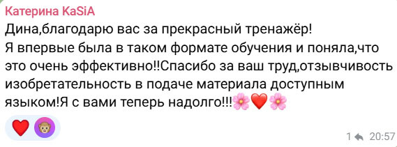 Сразу после оформления заказа вы получите письмо. В нем - ссылка для входа на закрытый сайт с тренажером, где нужно подписаться на закрытый чат в телеграме, в котором будет проходить вся работа.
